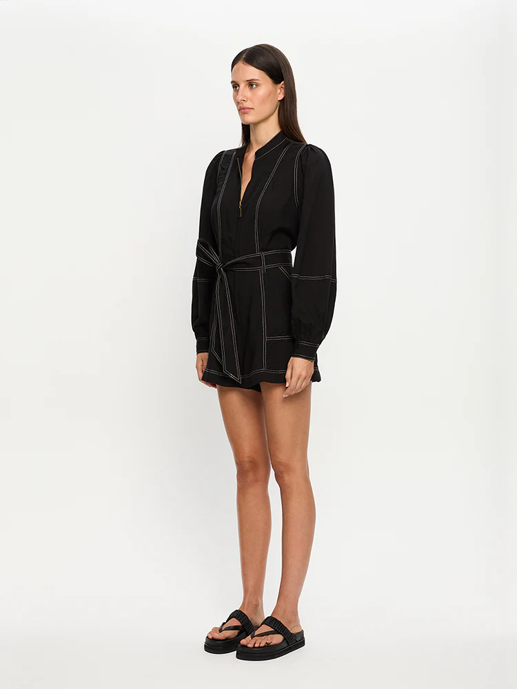 The Ada Playsuit in black features full length lantern sleeves, a removable waist tie, complete with contrast topstitching detail.