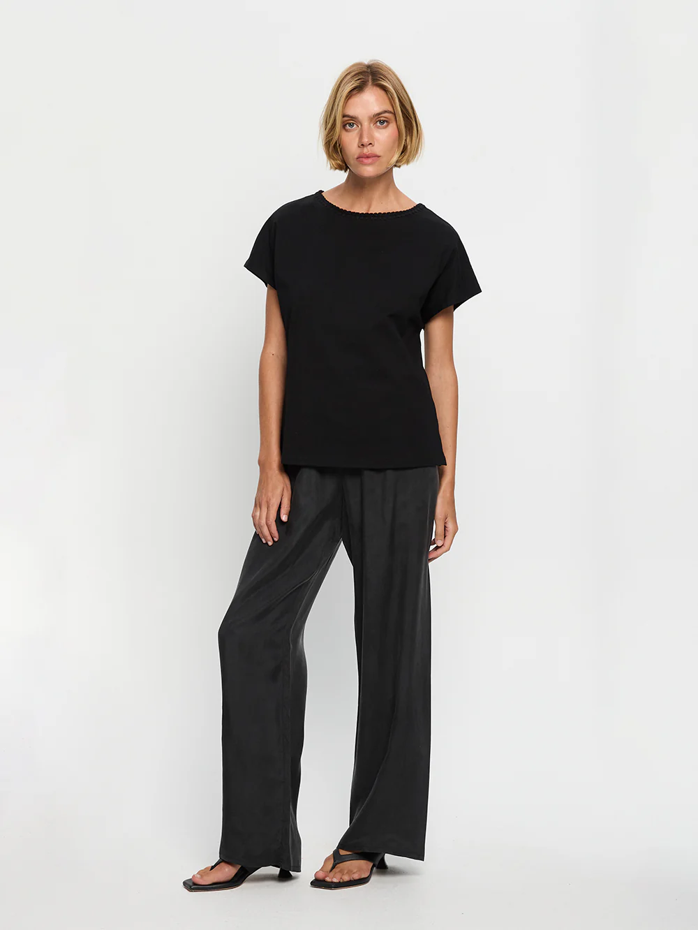 The Blythe Pant in black features a relaxed straight-leg silhouette with an elasticated waistband and adjustable drawcord for everyday comfort. Easy and versatile, it offers a refined approach to relaxed dressing.