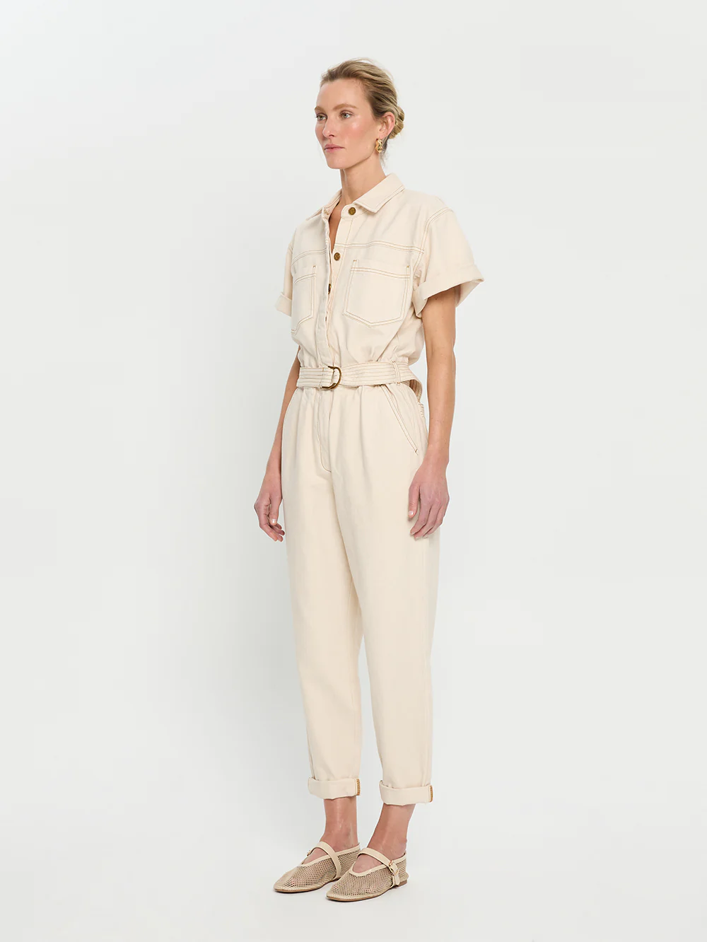 The Brae Boilersuit in cream is designed with a slim bodice, short sleeves and a straight leg and features a d-ring belt, patch pockets, complete with signature gold hardware.