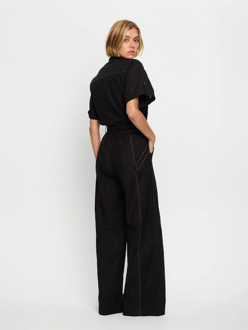 The Ebony Jumpsuit is a feminine take on utility in a timeless black colourway. Crafted from a linen-cotton blend, the jumpsuit features gold top stitch detailing, a button-front bodice with signature hardware, bodice and pant patch pockets and a fly front zipper. Accentuate the waist with our signature D-ring belt.