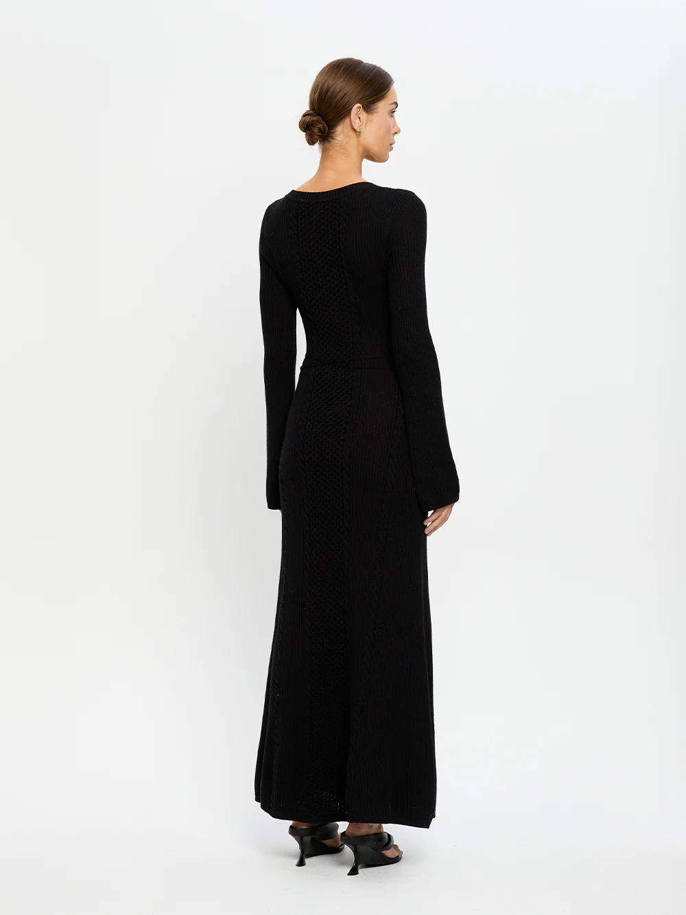The Elliot Knit Dress is a flared maxi silhouette featuring a v-neckline, cable knit stitch detailing, complete with waist ties.