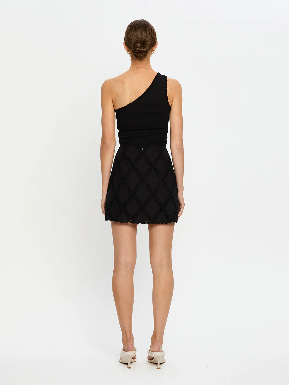 The Izzy Mini Skirt in black is crafted with a diamond-pattern design and crochet inserts, featuring a fitted waistband and a softly flared A-line silhouette. Delicate lace edging along the hem adds a refined, textural finish. Pair with the matching Izzy Shirt for a coordinated set, or style with a simple tank and sandals for relaxed daytime ease.