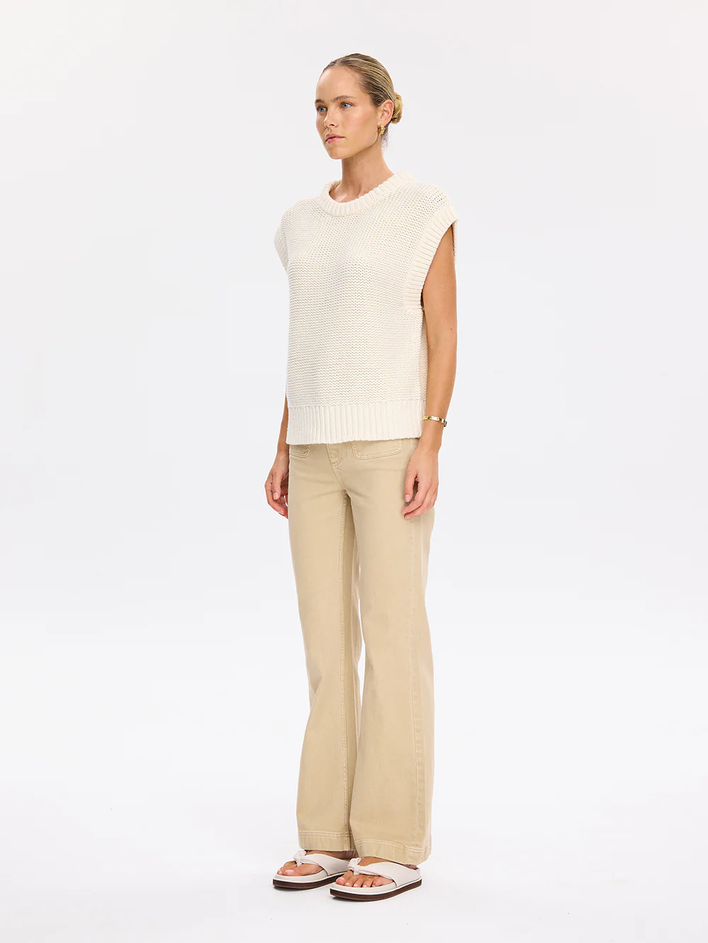 The Olesia Knit Vest in cream is an oversized silhouette featuring a rib detail at neckline, cuffs and hem.
