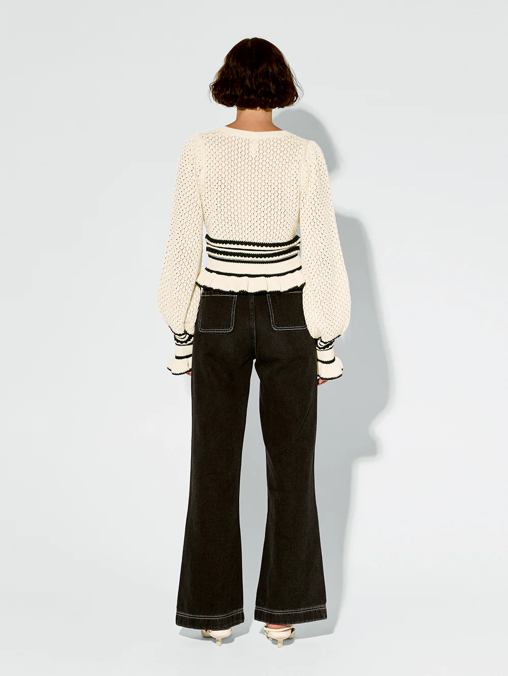 The Rafaela Knit Top in fresh cream and black hues, crafted from 100% Cotton. Featuring a high neckline, lace knit stitch design on the bodice and sleeves, complete with contrast frill details through the waist and cuffs.