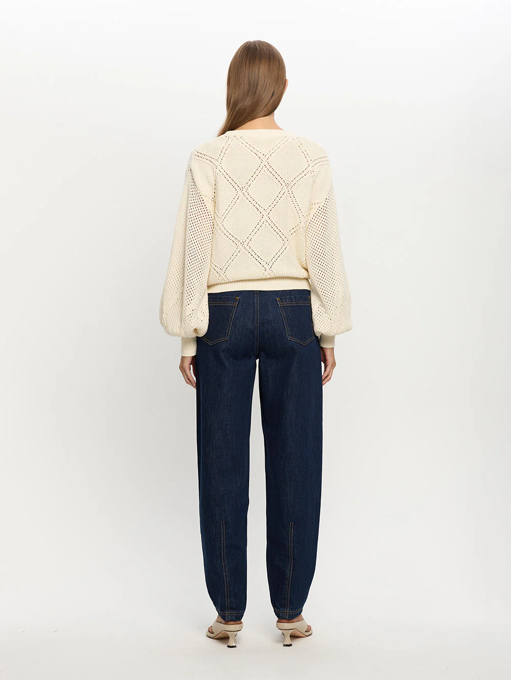 The Samara Knit Top in cream is crafted in an intricate diamond design featuring a round neckline, dropped shoulders, long sleeves complete with a ribbed hem and cuffs.