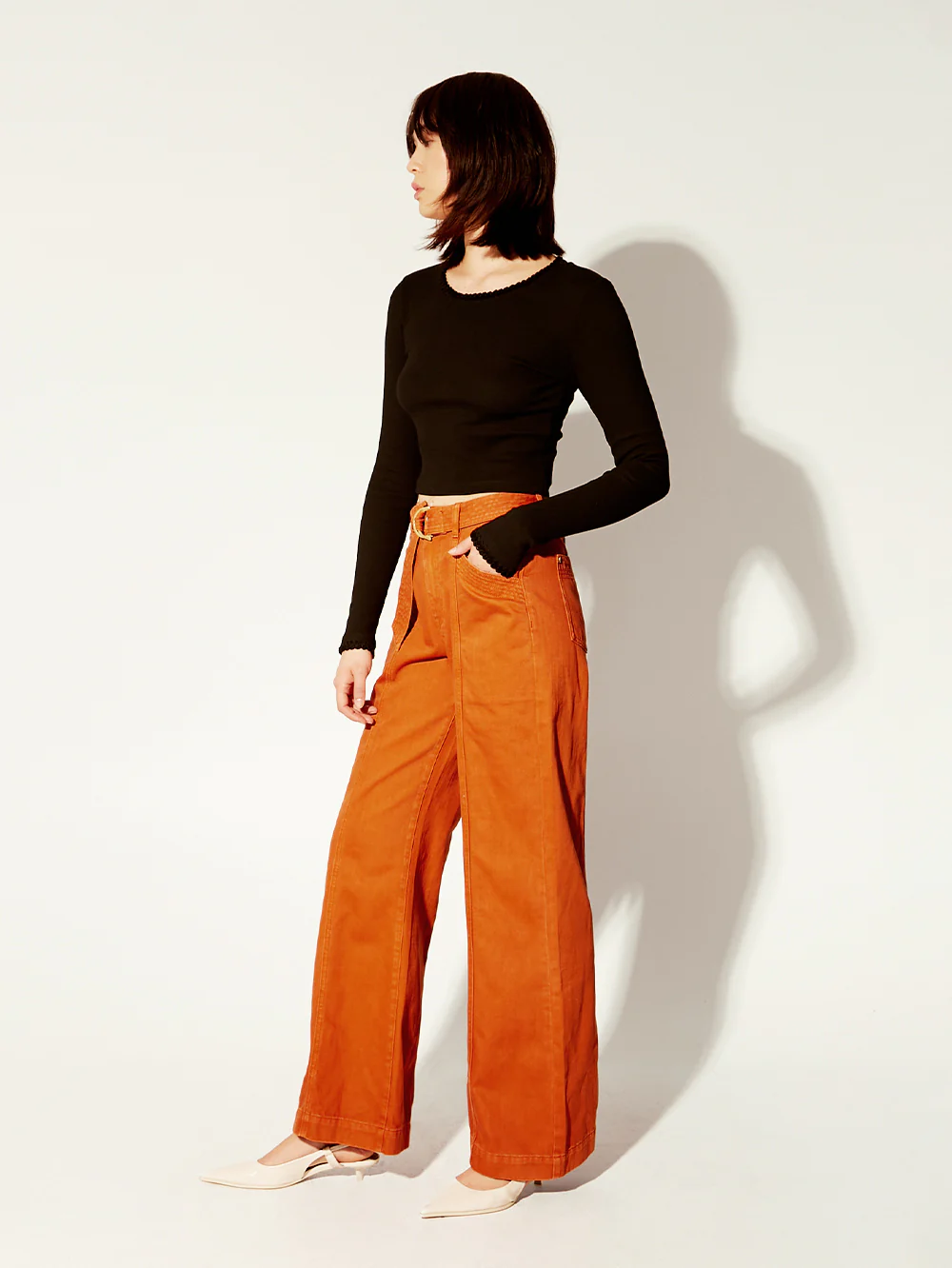 The Tallulah Crop Top in black is a fitted cropped silhouette featuring a high neckline, full-length sleeves, complete with soft crochet detailing.