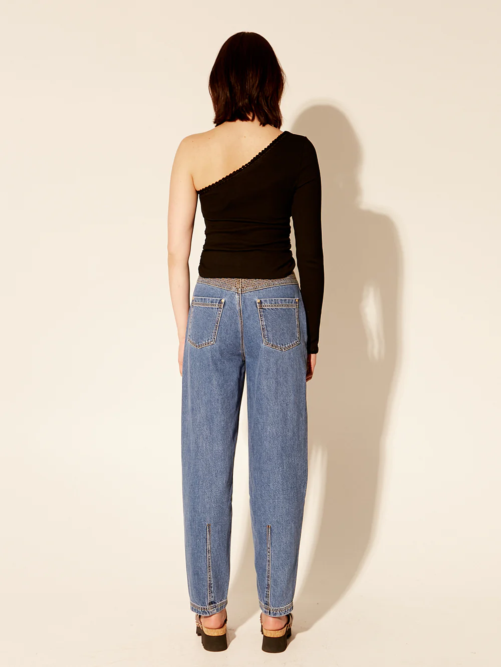 Designed in a fitted ribbed knit, the Tallulah One Shoulder Top in a black features a one shoulder, full length sleeve, side gather detail, complete with soft crochet edging.