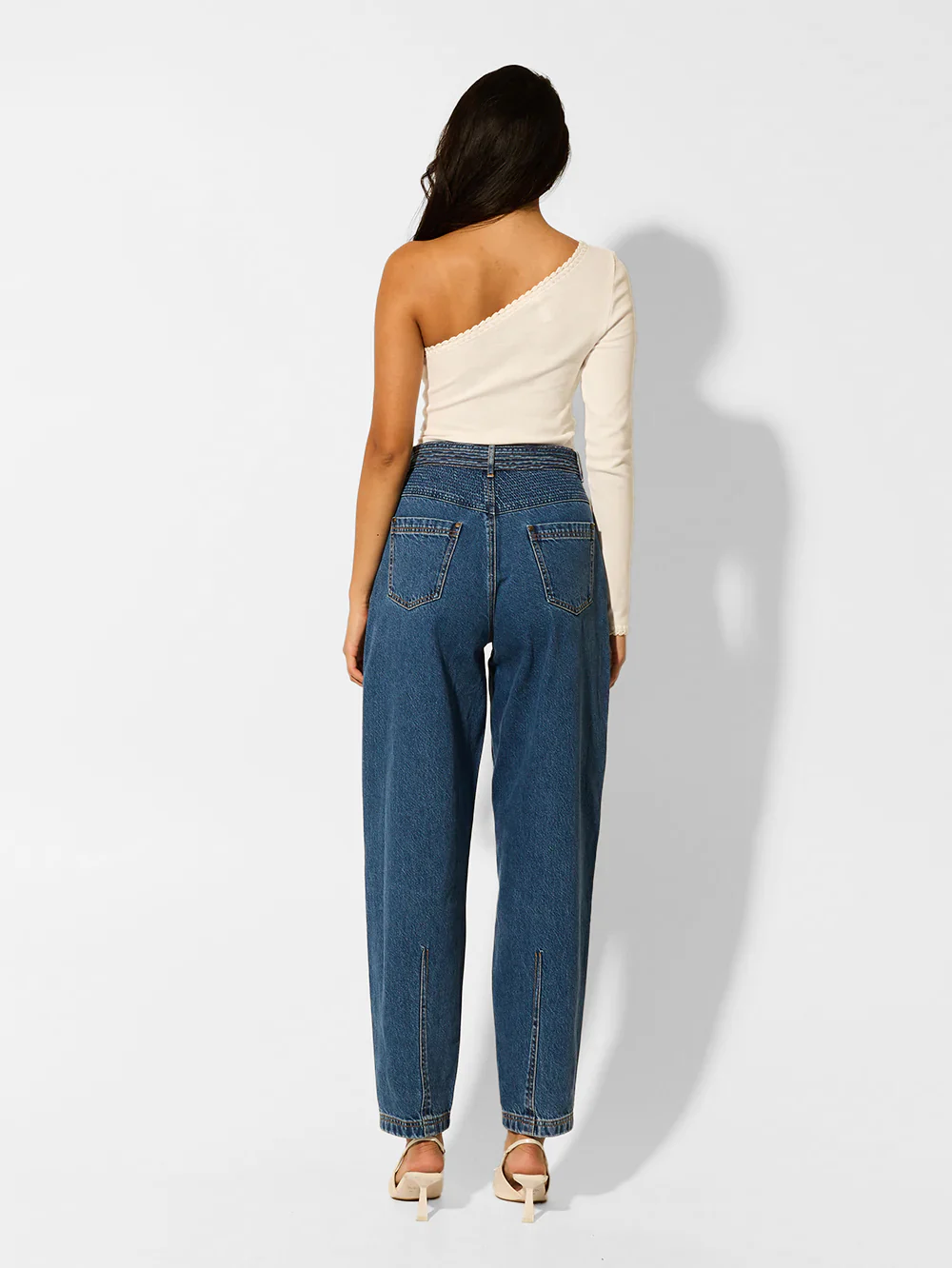Designed in a fitted ribbed knit, the Tallulah One Shoulder Top in an ivory hue features a one shoulder, full length sleeve, side gather detail, complete with soft crochet edging.